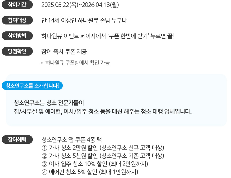 - 본 이벤트는 하나은행과 ㈜청소연구소 함께 진행하는 제휴 이벤트 입니다.