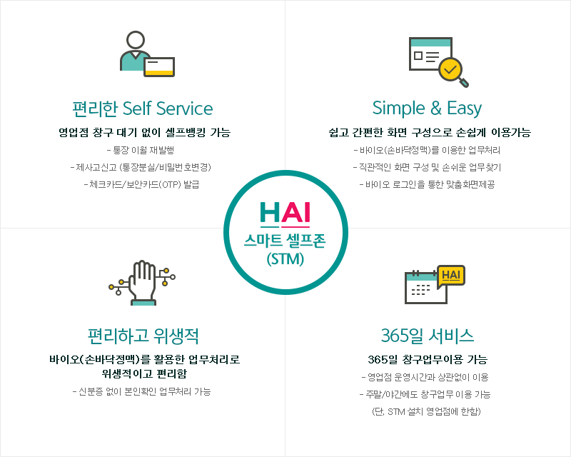 Home>고객센터>이용안내>전자금융>HAI Smart Self Zone (STM) 이용 안내